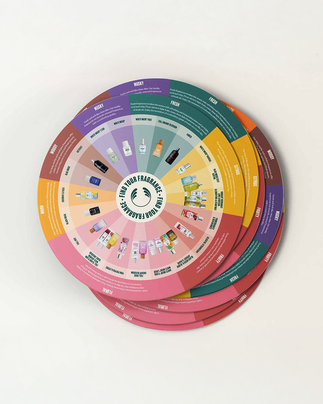 A custom-designed fragrance wheel created to help customers quickly understand and compare what each scent offers. By organising key aroma characteristics into an intuitive visual format, the wheel makes it easy to explore fragrance families and identify preferences at a glance.