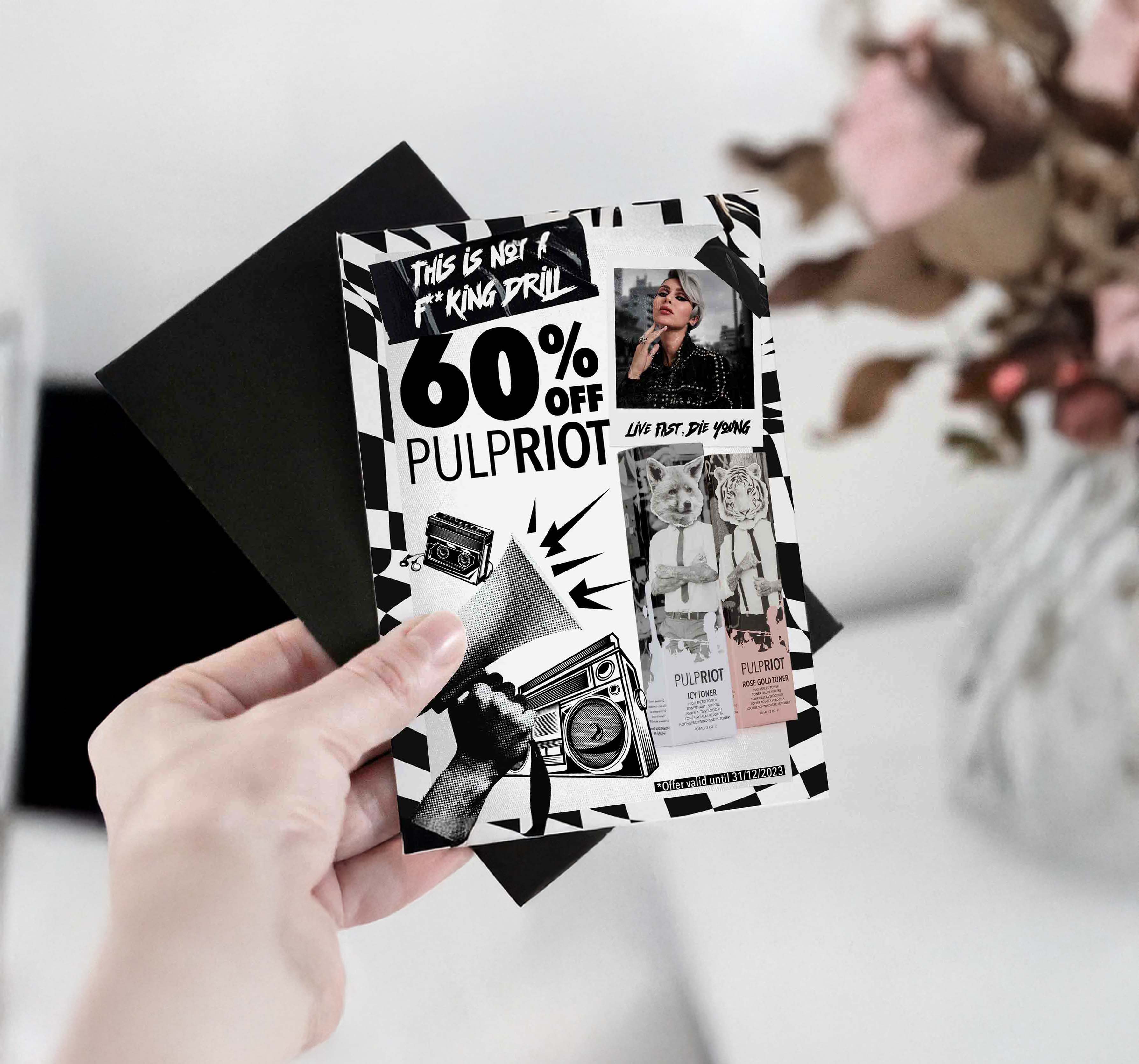 This flyer was created to reflect Pulp Riot’s rebellious attitude toward hair colour and self-expression. The design leans into bold typography, high contrast, and controlled chaos to mirror the brand’s refusal to follow traditional beauty rules. I wanted the layout to feel loud, unapologetic, and disruptive — echoing how Pulp Riot encourages artists to experiment, break boundaries, and treat hair as a form of creative protest rather than conformity.